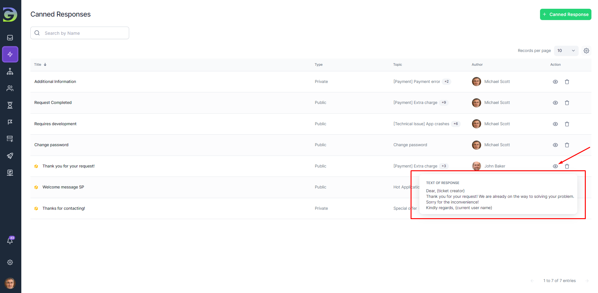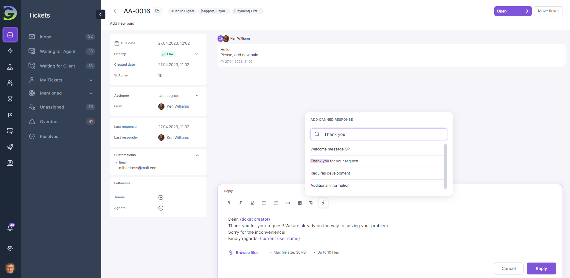 One of the powerful features of Canned Responses is the ability to incorporate variables. When a Canned Response with variables is applied, these variables transform into the relevant information present in the specific ticket, providing a personalized touch to customer interactions.
