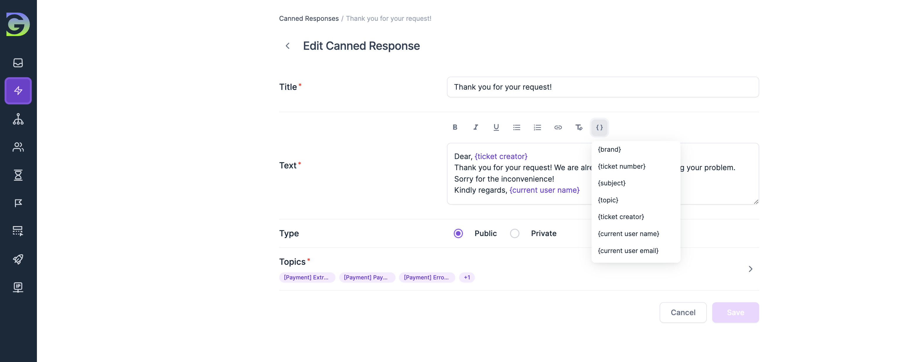 Public Canned Responses are versatile tools that can be crafted centrally by managers or administrators. These responses serve as standardized solutions accessible to all agents working on tickets. This ensures a unified and coherent approach to addressing frequently encountered issues.