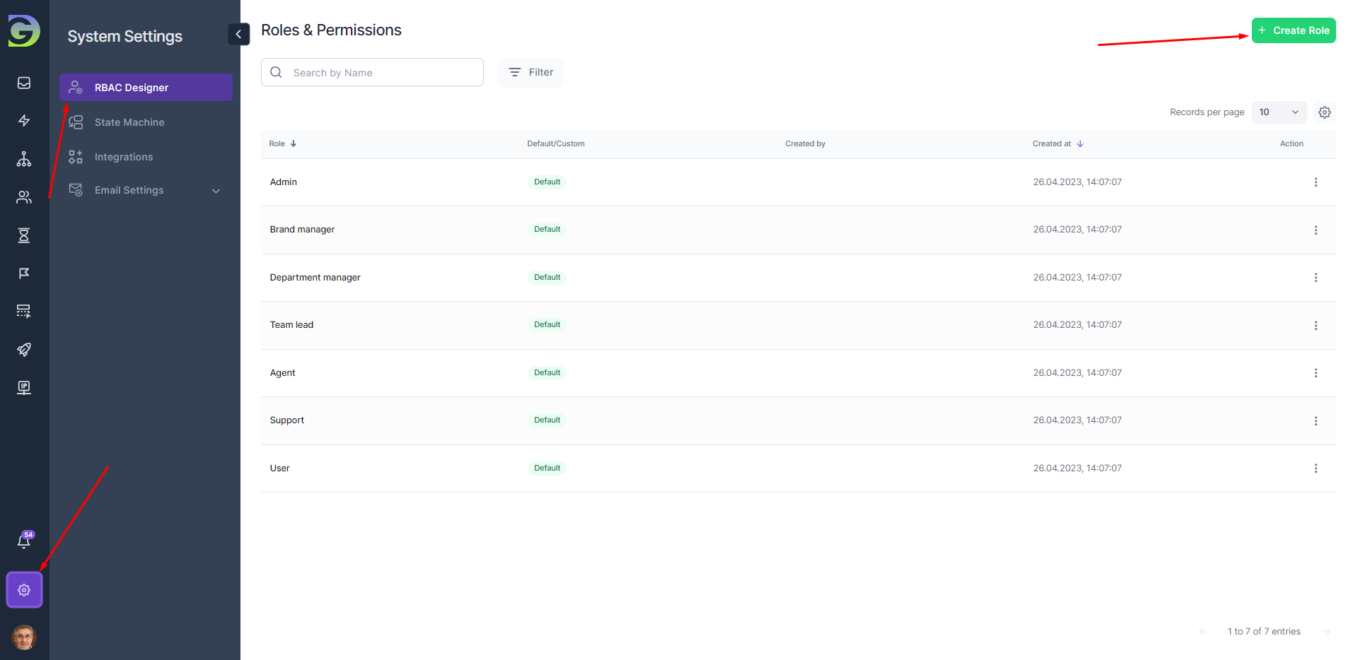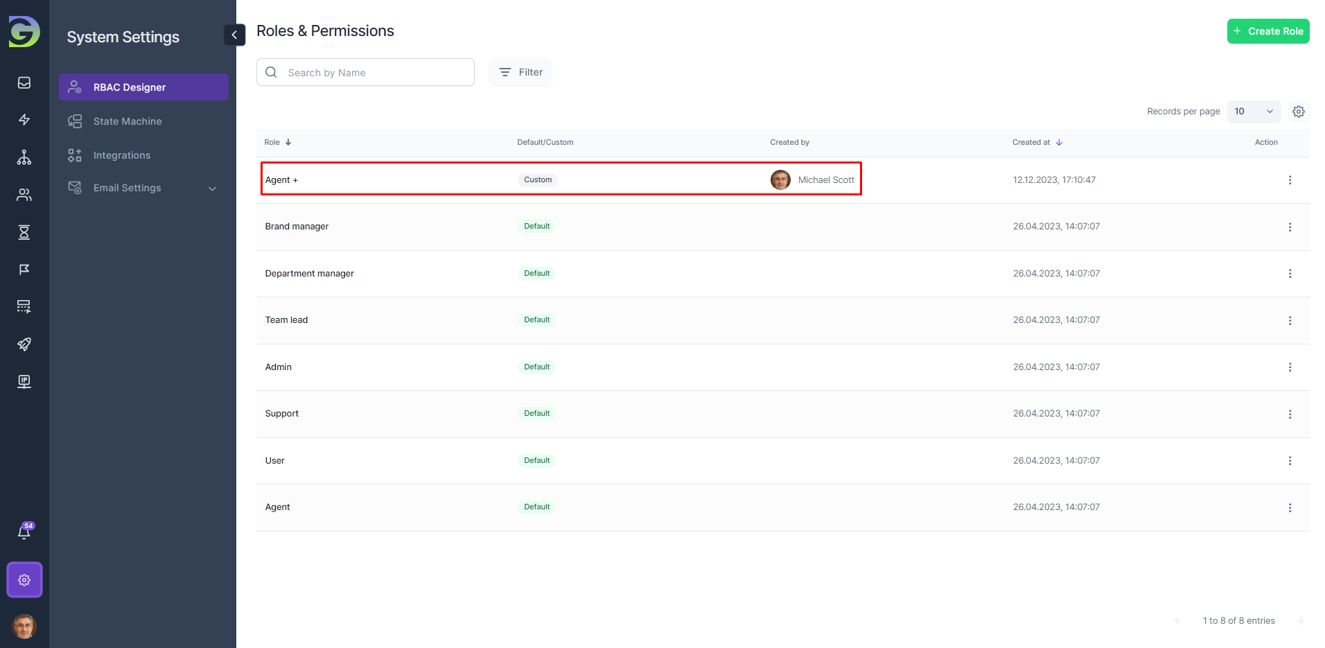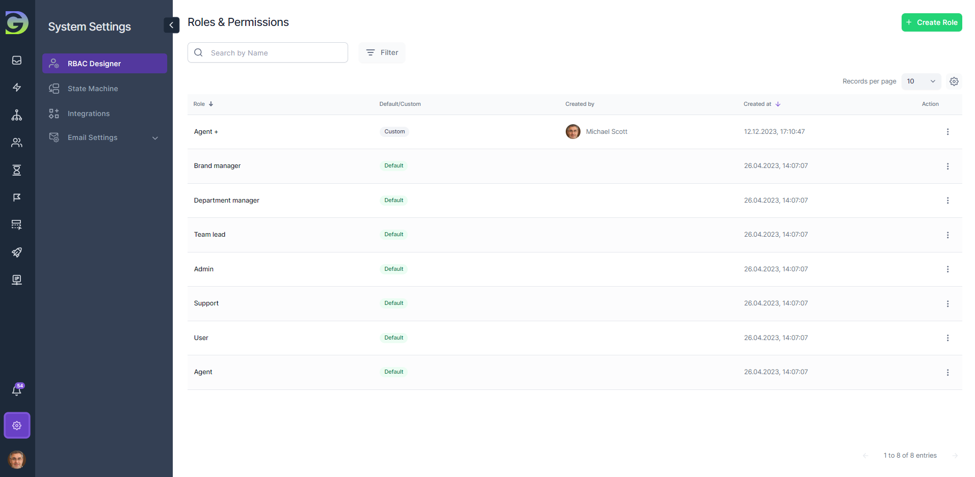 The RBAC Designer feature includes seven predefined roles by default: User, Agent, Team Lead, Department Manager, Brand Manager, Support, and Admin. Each default role comes with standard permissions tailored to its designated responsibilities. It's important to note that default roles cannot be edited, as they are preconfigured with system-standard permissions.