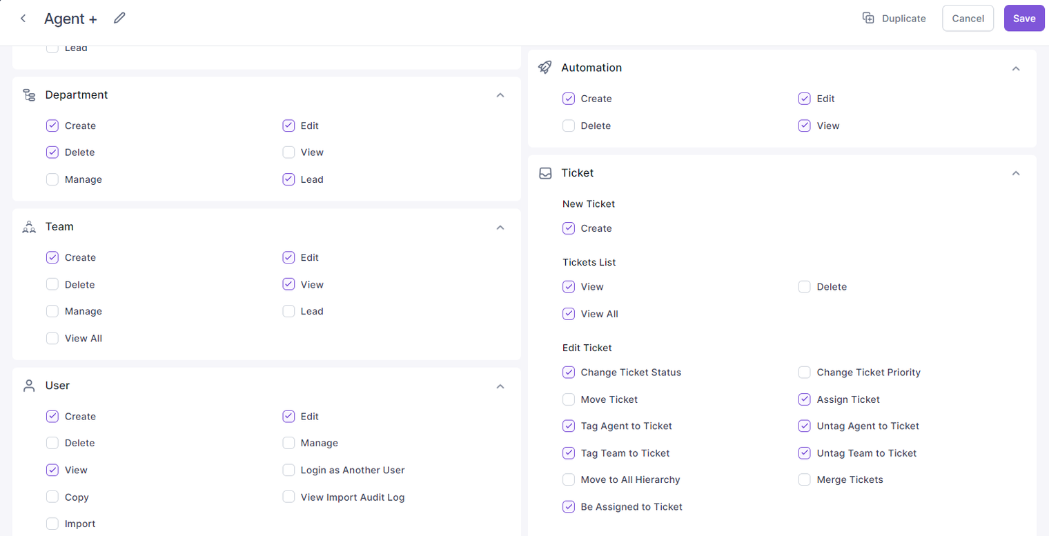 If you want to set or modify permissions for a Custom Role, you can easily do so on the Custom Role Editing Page. Simply navigate to the Roles List Page and click on the Role you want to edit. Here you can change the name of the Role, duplicate Role permissions for a new Role, and configure user access levels by toggling checkboxes next to permissions. The permission change process remains the same as the initial setup.