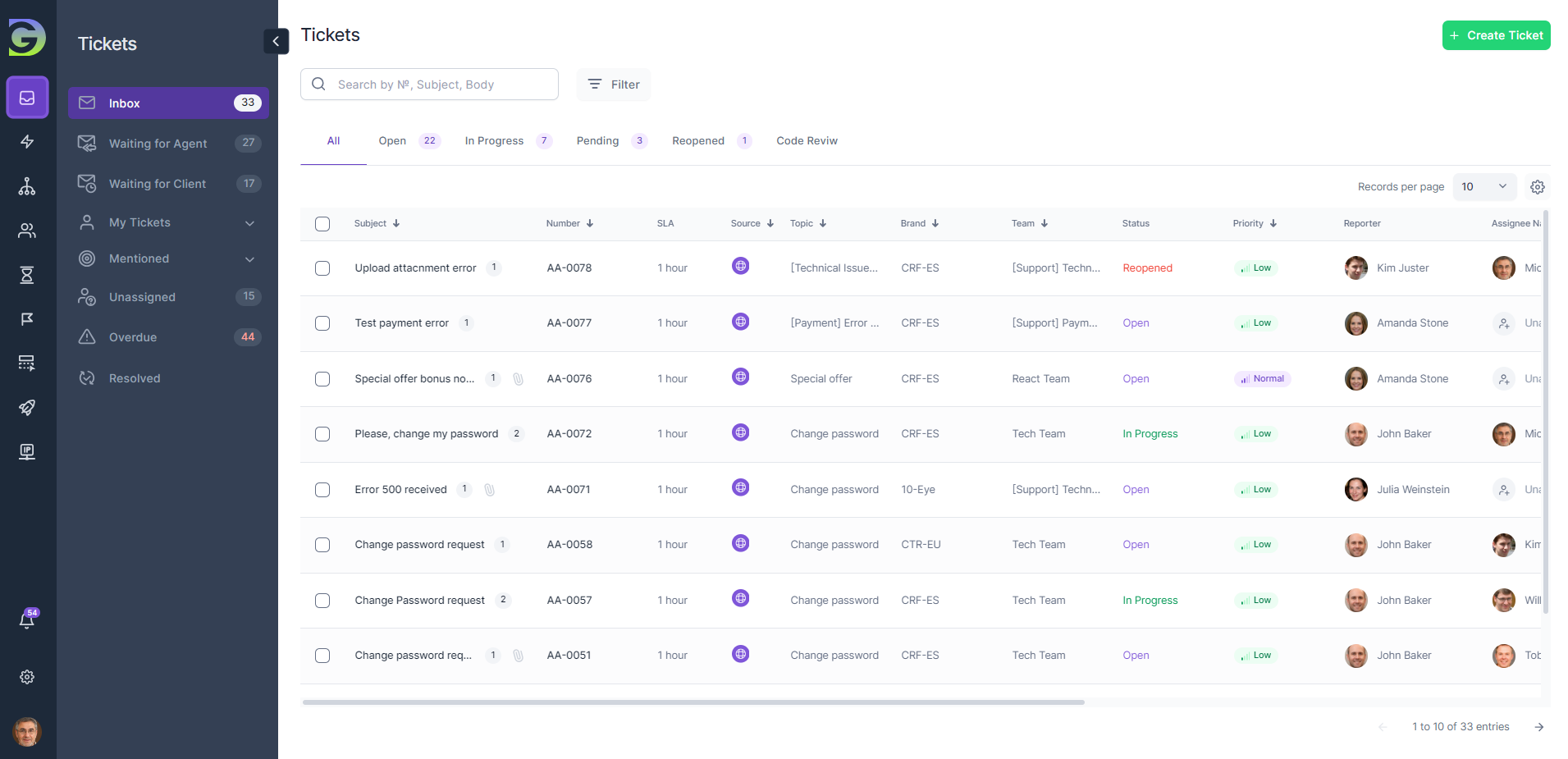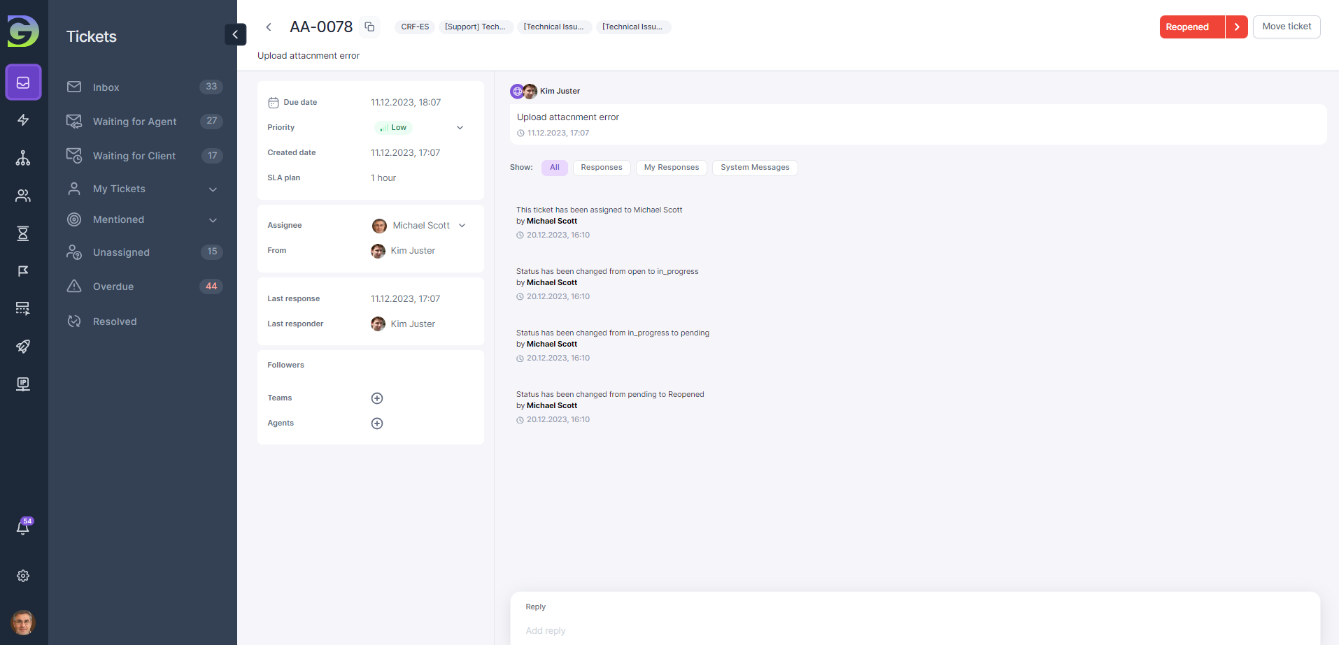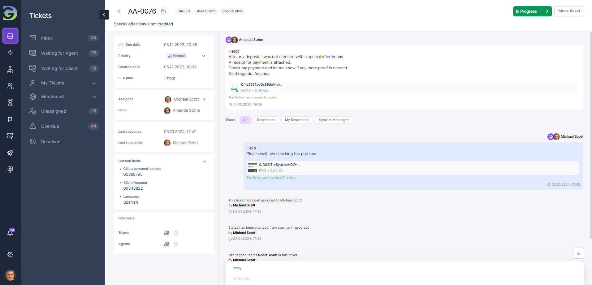 • Waiting for Me: includes all active (not resolved) and assigned to the Agent tickets where the last reply was from the Client.