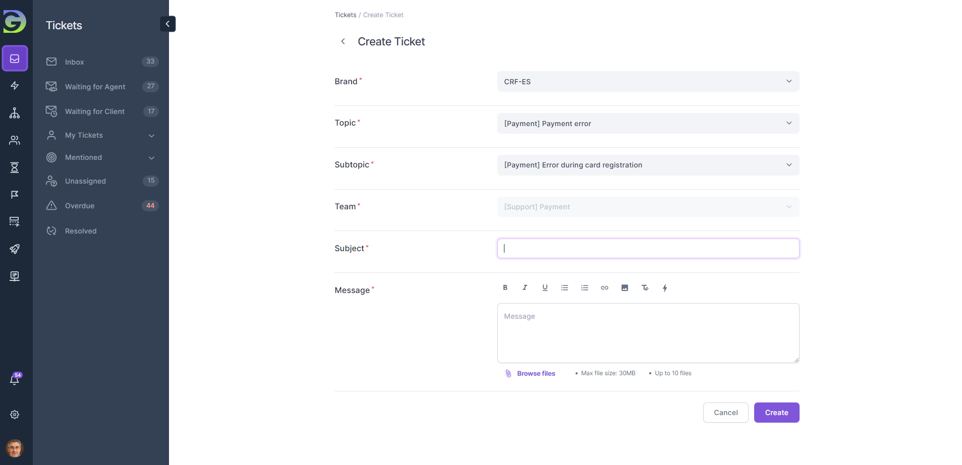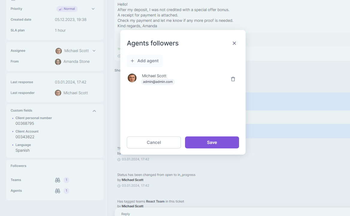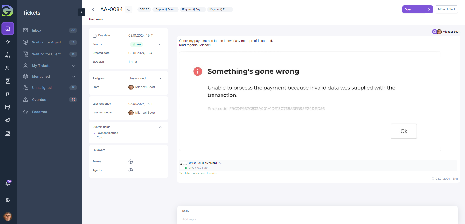 • Waiting for Me: includes all active (not resolved) and assigned to the Agent tickets where the last reply was from the Client.