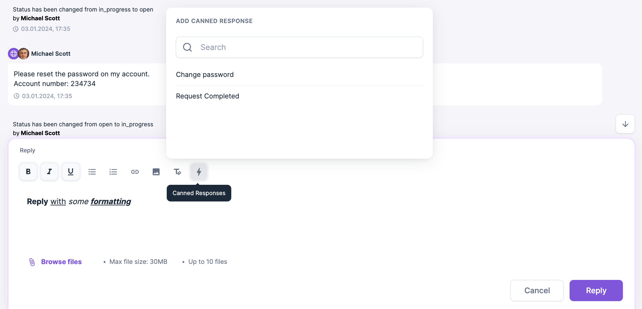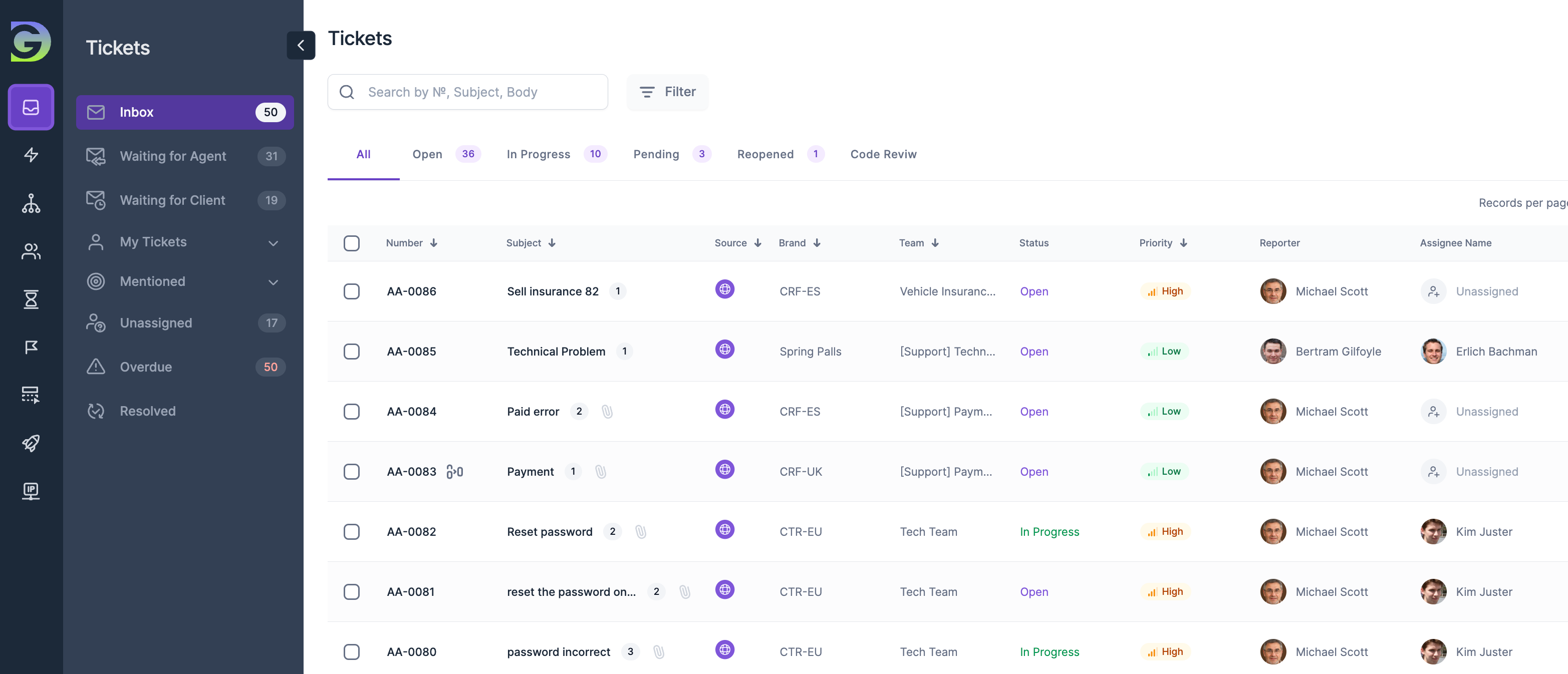 brand, team, status, priority, reporter, assignee name, last replier, last reply